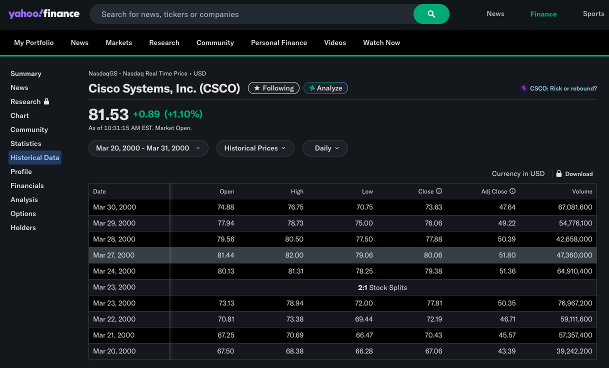What happened to Cisco stock post March 27, 2000? Well, it was pretty quick on the way down: